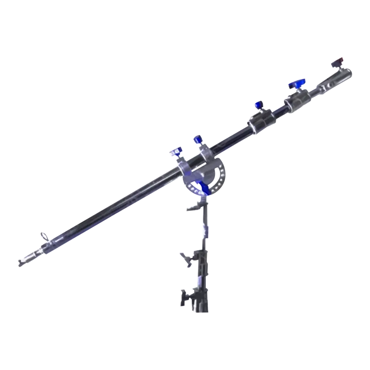 Built from steel with a multi-section telescopic design, the Solar Boom Rod extends from approximately 5.3 feet to around 10 feet, offering flexibility for various set sizes. The pivoting clamp lets operators adjust tilt and pan angles under load, with strong locking mechanisms to hold position securely. A dedicated counterweight hook at the rear ensures the boom remains balanced, essential when working with heavier lights or large modifiers.